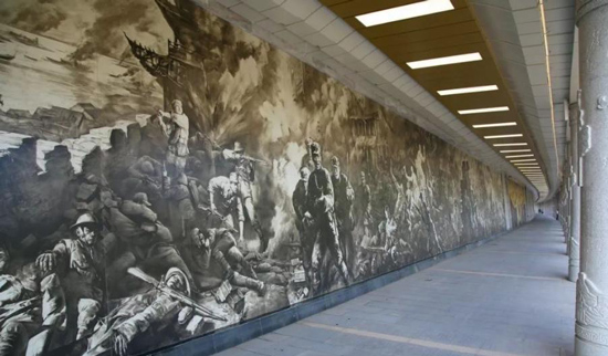 画墙里的作品个个有来头。想看看老常德的样子,找杜飞教授的《老河街》准没错,高温瓷板上的青花线描,把民国沅江码头的商船、河街的烟火气画得活灵活现,连老常德人都能认出熟悉的场景。缅怀先烈就去看《常德会战》,大瓷板素描用老照片般的质感,再现了当年的壮烈历程。还有全国独一份的透明彩色玻璃镶嵌壁画《一带一路》,阳光透过时流光溢彩,不少人特意来拍光影大片。更难得的是,这里还让不少“失踪”的经典壁画重见天日,比如曾获全国美展银奖的《创造收获欢乐》,以及当年轰动首都机场的《泼水节》,如今都以新材质在沅江边“复活”了。
