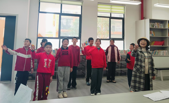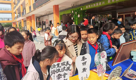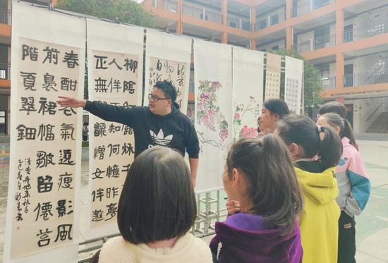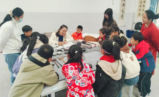 专家指导环节更是将本次活动推向高潮。郭立纯校长现场泼墨,边创作边讲解书法用笔与章法,有求必应,毫无倦色的赠送墨宝近三个小时,然后欣然接受学生回赠的习作,营造出浓厚的师生共学氛围;湖南幼专李余良教授的硬笔书法功底深厚,现场展示了他的书法作品《桃花源记》、《千字文》,同学们以为是印刷出来的,所以芙蓉学校的师生听李老师的课特别认真;徐定仙教授为本次展览绘制了30余幅题材丰富的国画和书法作品,徐教授边给小朋友演示竹子的画法边用儿童化的口语说“毛笔是魔法棒,宣纸就是魔法的舞台”,激励小朋友们大胆创作;杨冬娥教授则用“波浪线”和“山脊线”将朗诵技巧可视化,让诗词活了起来;龙熙银教授则带领“小诗人们”品读课文古诗、指导童诗写作,他说“诗要有温度,字才能着火”。一系列互动课程,构建起一场多维、沉浸的传统文化体验,在学生心中深深植下人文艺术的根脉。