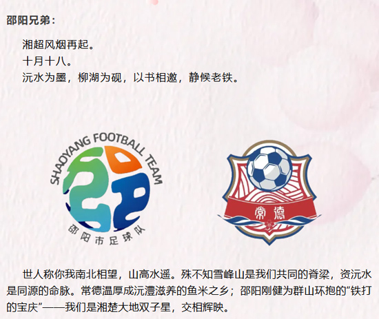 让山山水水为我们喝彩—— 雪峰山见证我们的拼搏,沅资水聆听我们的呐喊!你的崀山,丹霞如血,原驰巨象。我的桃花源,落英缤纷,闲适深藏。你的南山,风吹草低,血脉偾张。我的柳叶湖,烟波浩渺,豪情舒畅。愿我们足下留情义,场上见风格,共同涨粉,一起出圈。彼此技术可被拿捏,兄弟情谊必须满格在线!