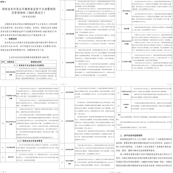 本网讯(文/杨亮)安全无小事,责任大于天。近期,湖南省先后发布《两客车辆智能监管平台报警规则及管理细则(2025版)》、《农村客运车辆智能监管平台报警规则及管理细则(2025版试行)》,为道路运输安全监管划定“硬标准”。