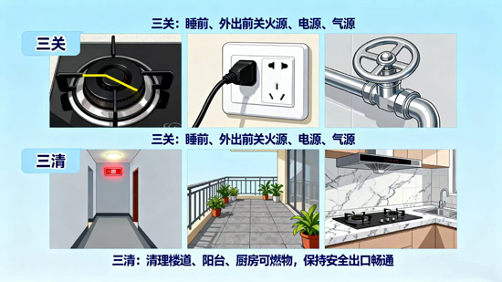 首要遵循“三关三清”原则,从源头除隐患:“三关”睡前、外出前关火源、电源、气源;“三清”清理楼道、阳台、厨房可燃物,保持安全出口畅通。