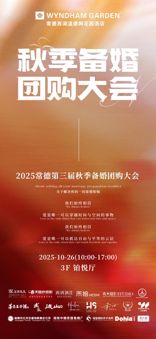 本网讯(文/杨亮)秋意渐浓,爱意盈怀。在这个收获与浪漫交织的季节,常德西湖温德姆花园酒店备受期待的“第三届秋季备婚团购会”将于10月26日温馨绽放,为即将携手一生的准新人们,开启一站式的幸福筹备之旅。